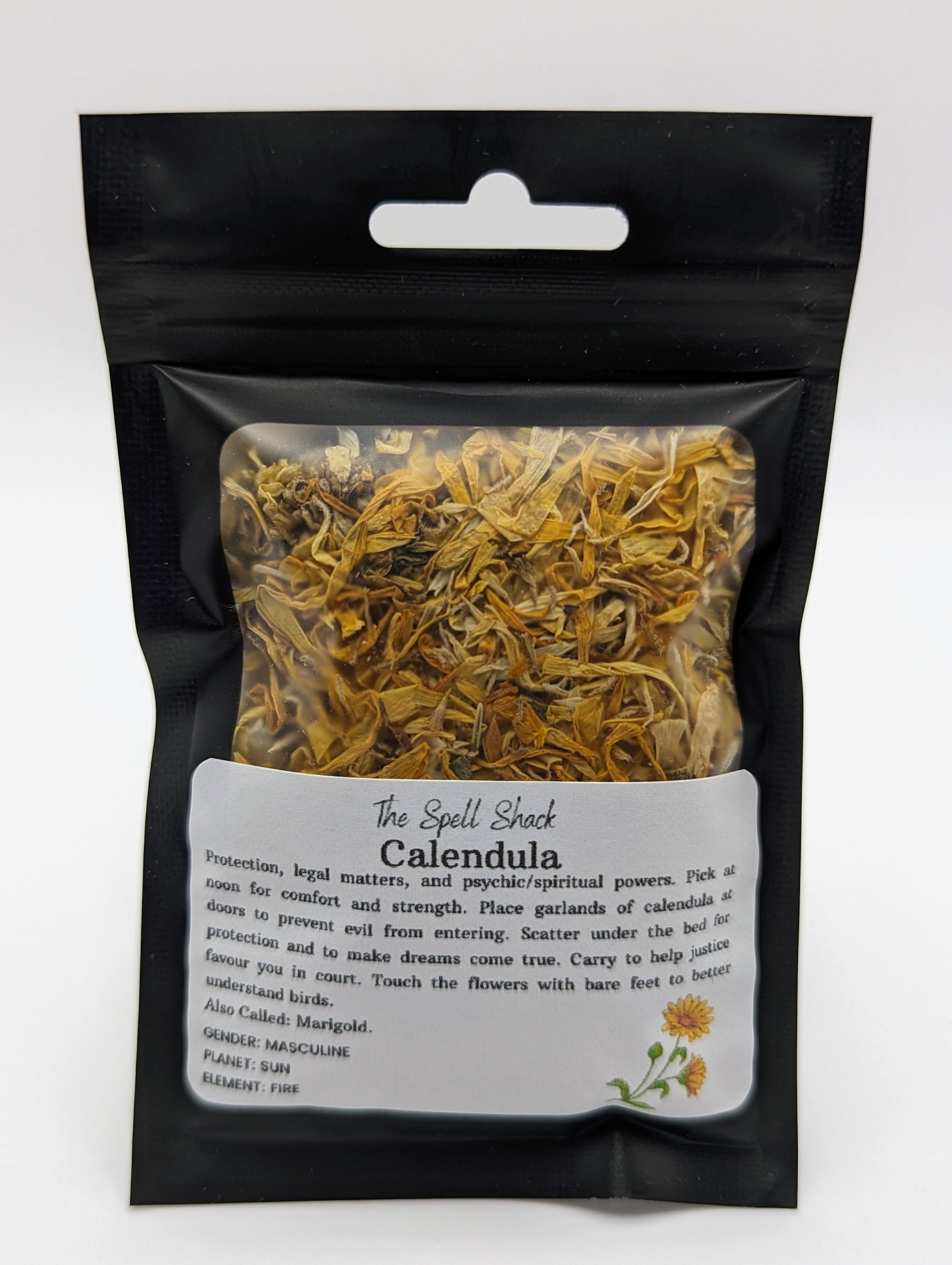 Protection, questions juridiques et pouvoirs psychiques/spirituels. Cueillez à midi pour plus de confort et de force. Placez des guirlandes de calendula aux portes pour empêcher le mal d'entrer. Dispersez-le sous le lit pour vous protéger et réaliser vos rêves. Portez pour aider la justice à vous favoriser au tribunal. Touchez les fleurs pieds nus pour mieux comprendre les oiseaux.