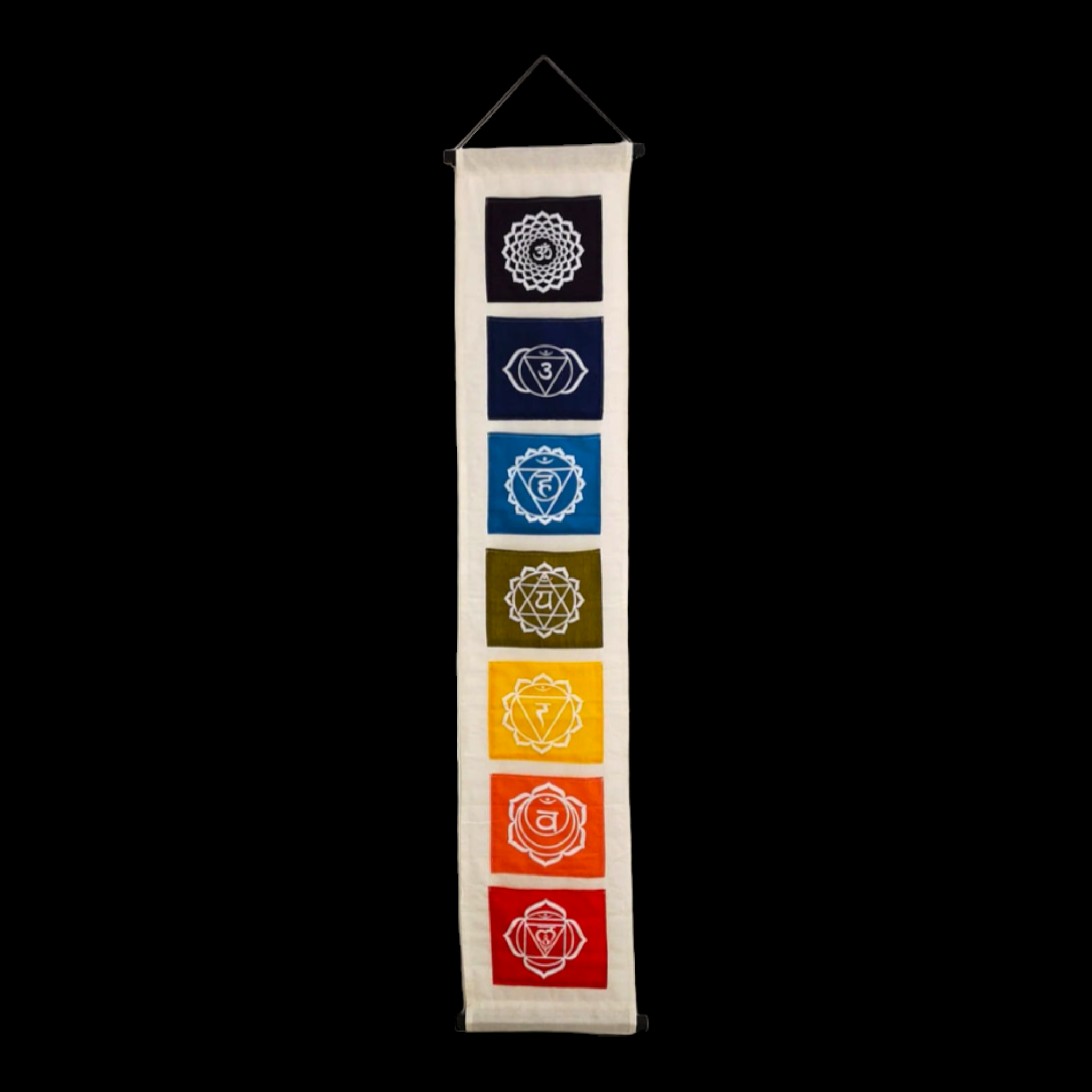Cette superbe bannière des chakras à rabats présente avec élégance les sept symboles des chakras imprimés en couleurs vives sur un fond de coton blanc. Vous aimerez certainement utiliser les poches pour ranger vos petits items et trésors les plus précieux. La bannière est fabriquée à 100 % en coton et comprend des chevilles en bois avec une ficelle pour une suspension et une présentation plus faciles et efficaces.