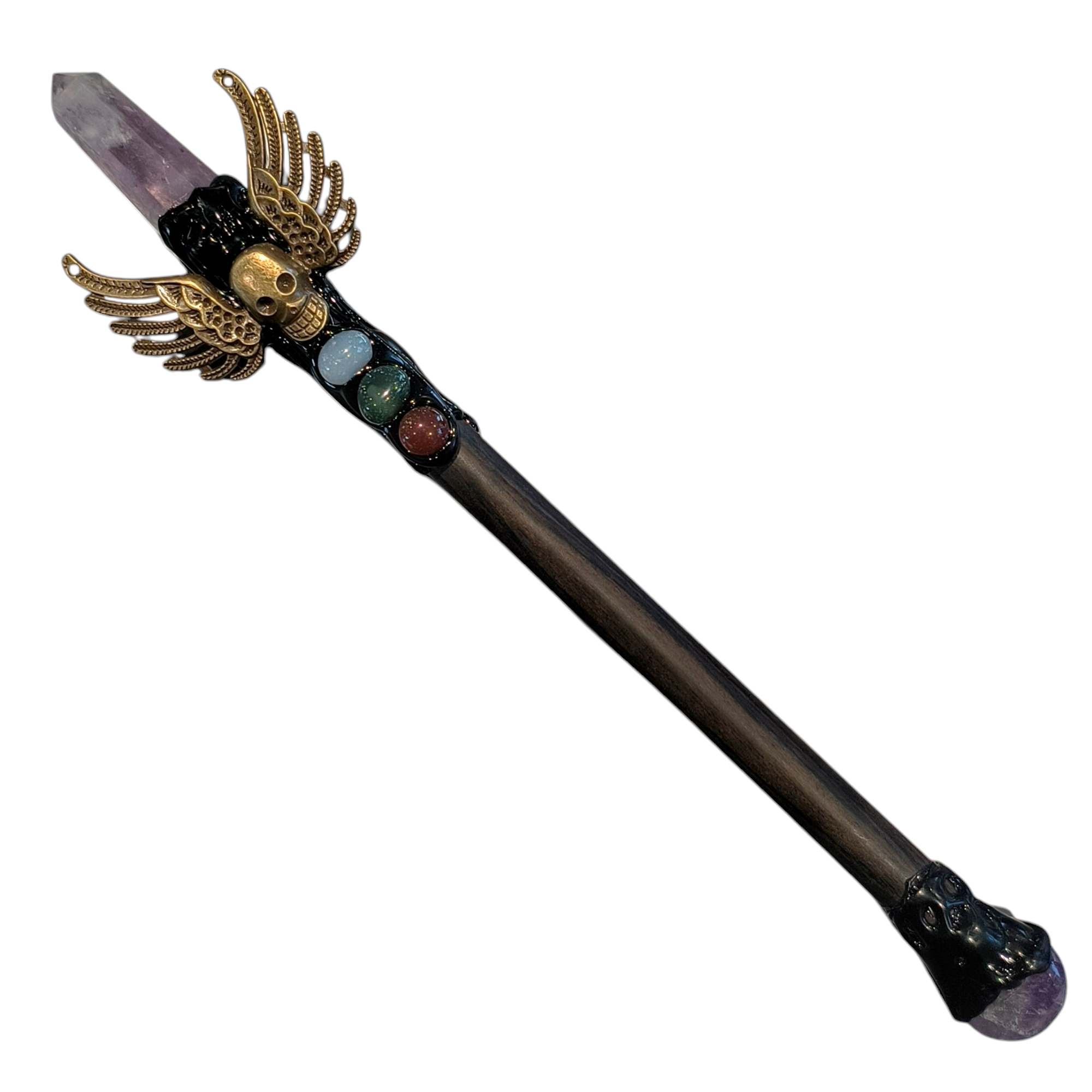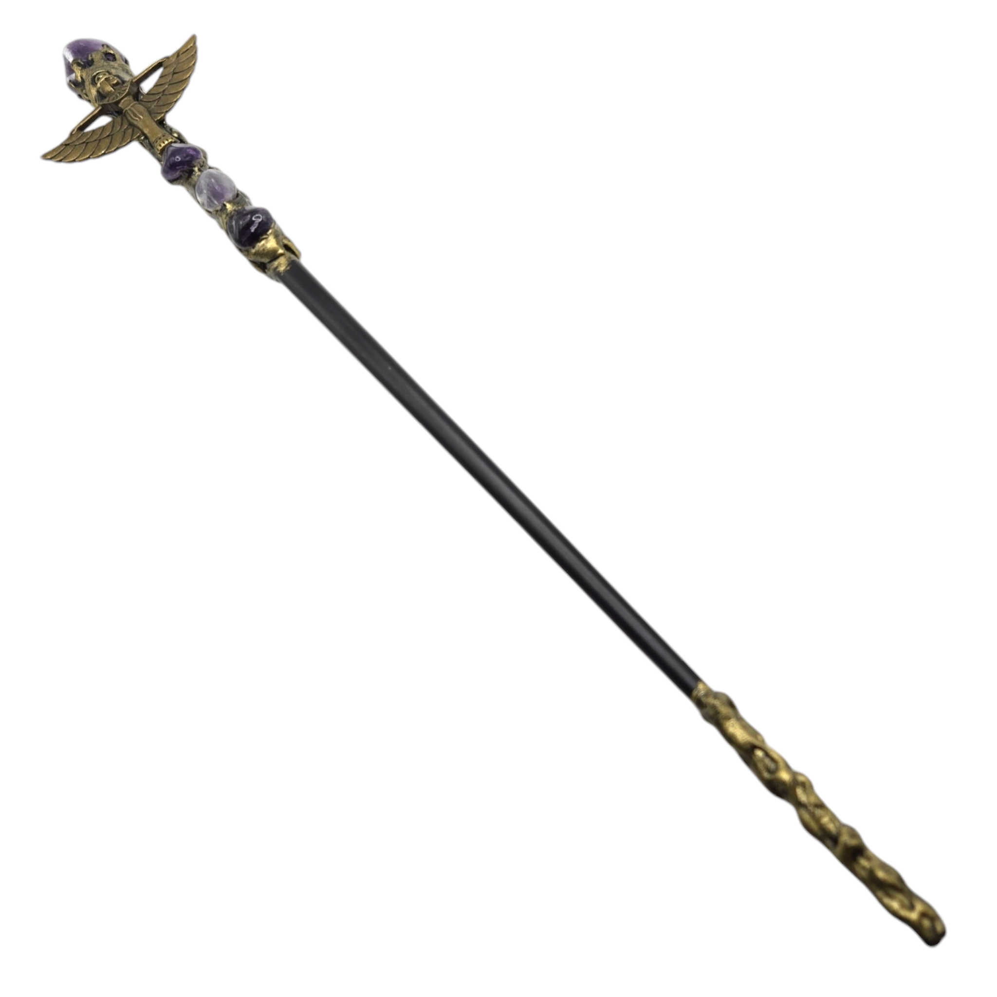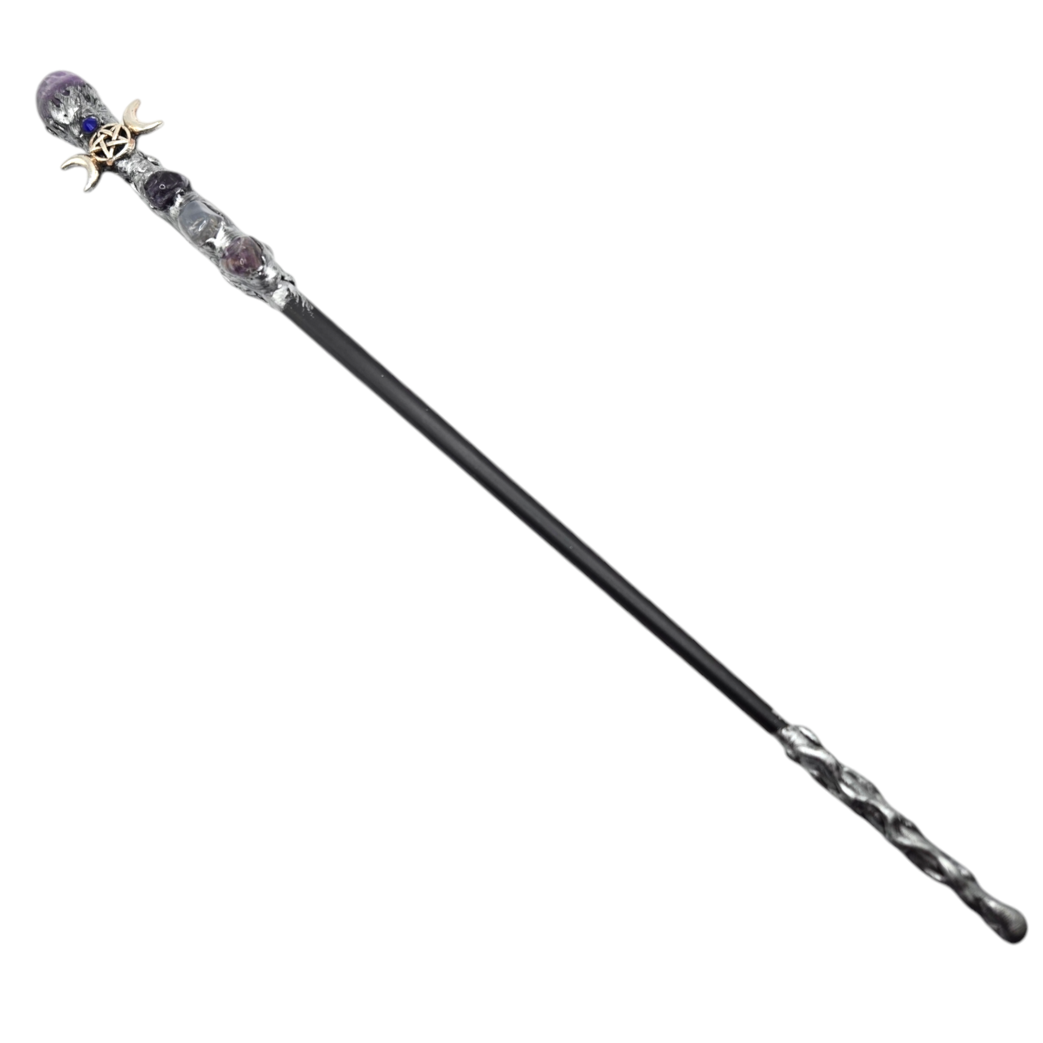 This Witch Sticks is a decorative and mystical item, made of wood. The wand features an amethyst point crystal at the top, which is believed to enhance spiritual energy and promote intuition.